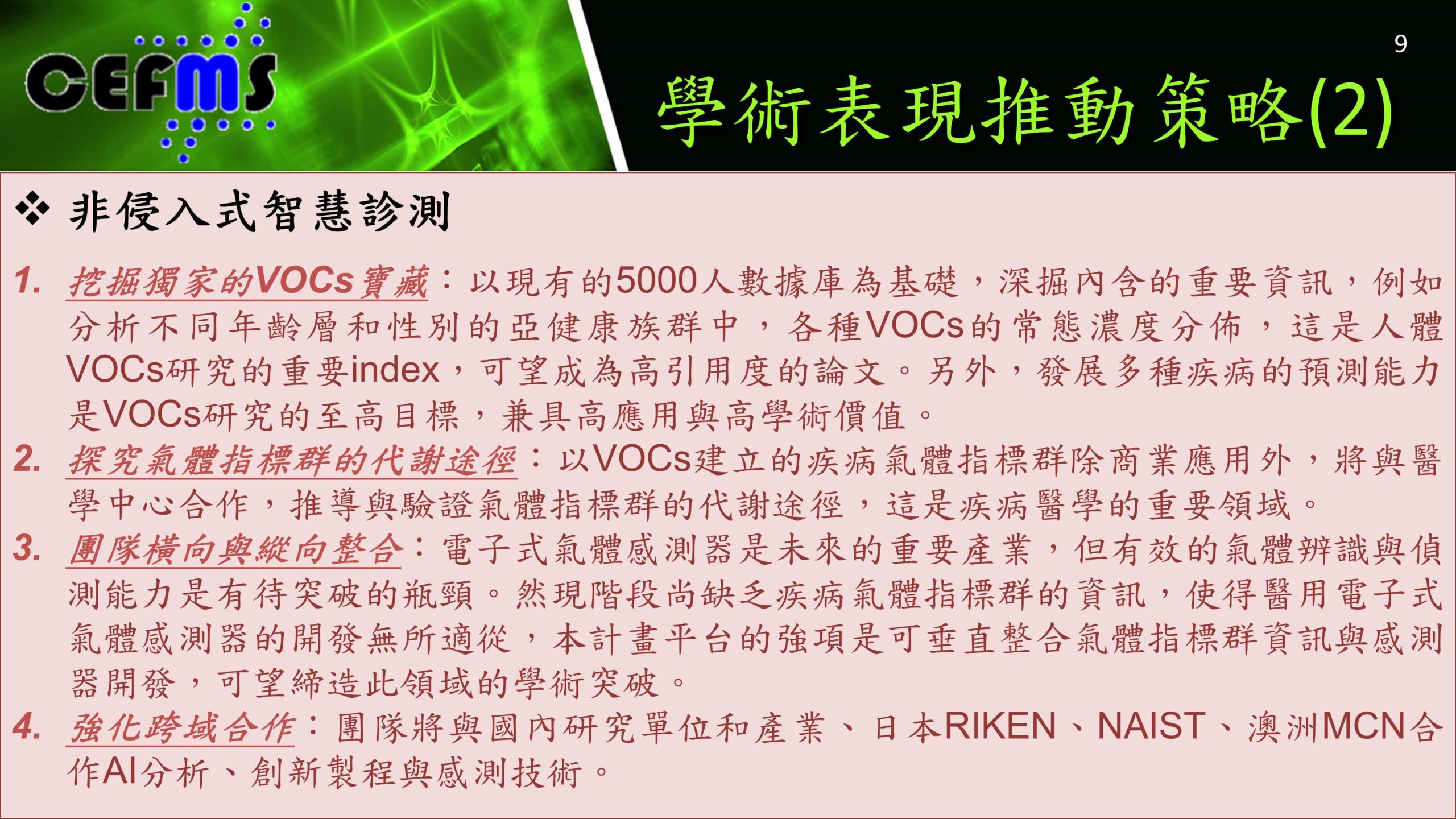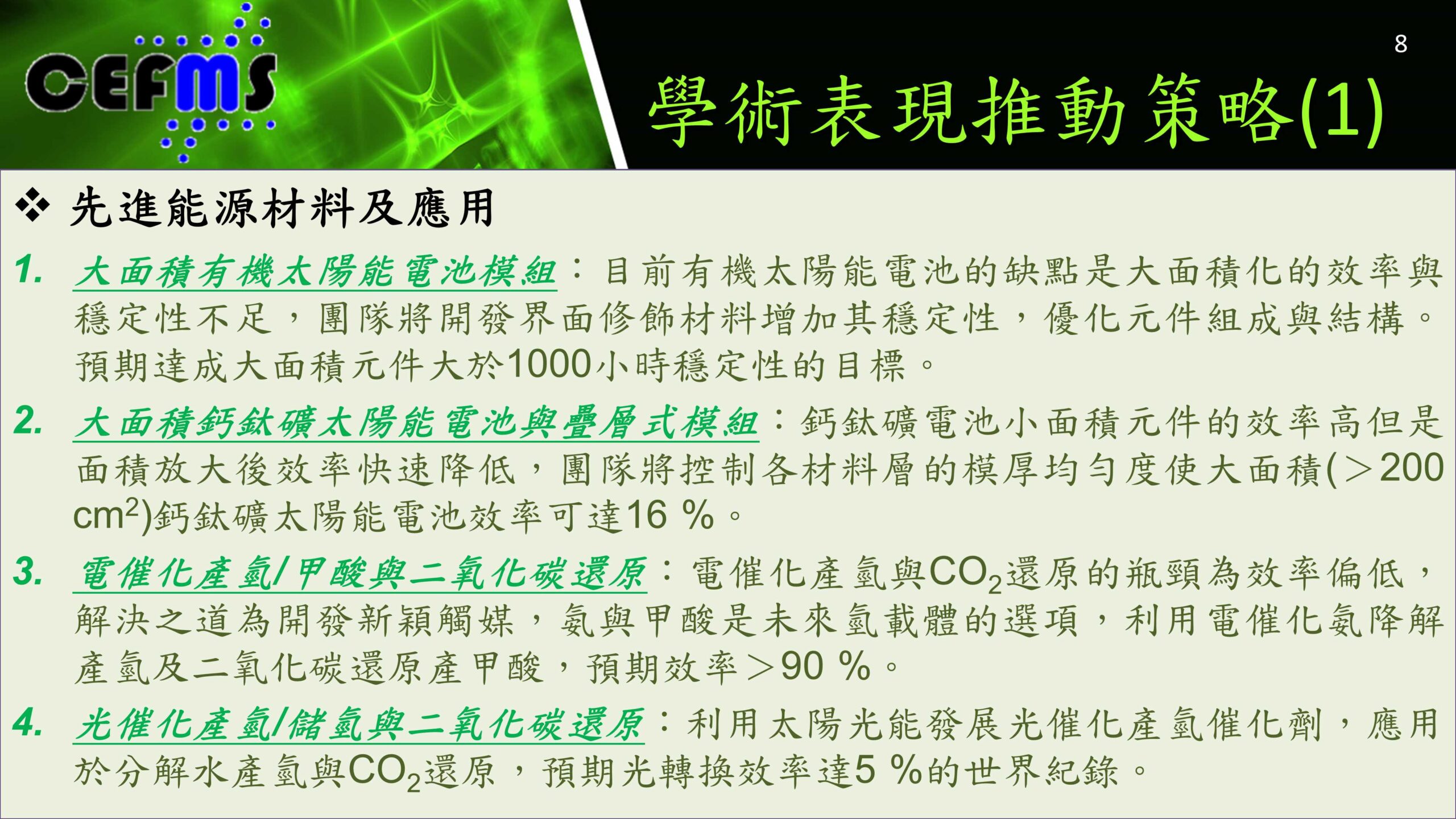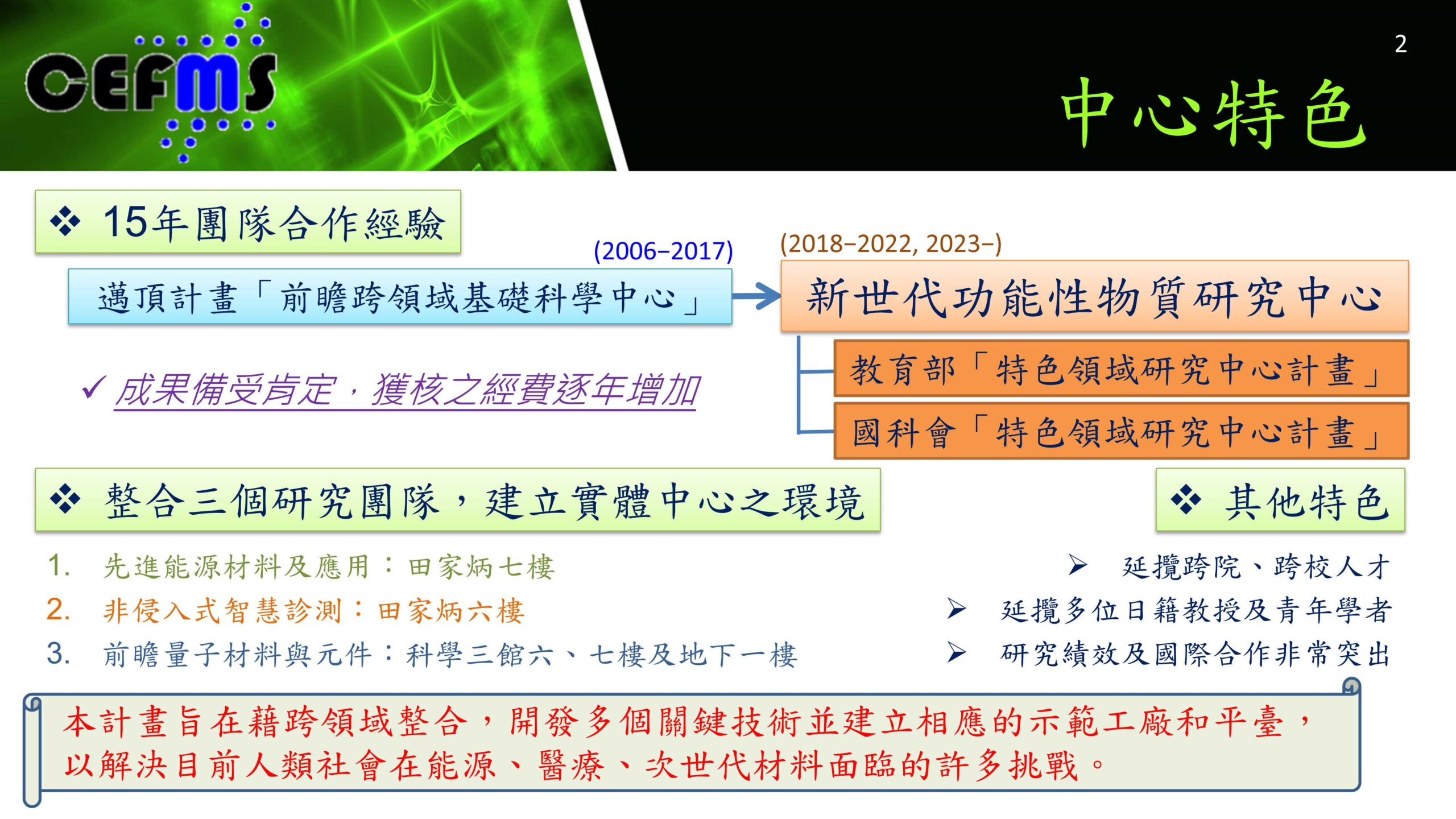 第一期計畫中,「新世代功能性物質研究中心」整合三個團隊,從事「綠能材料及柔性元件開發」、「智慧生醫檢測及柔性電子技術開發」及「智慧元件開發」之研究。在第二期計畫,「新世代功能性物質研究中心」進一步提昇、整合原有團隊,並加入多位傑出新血,結合來自7院2校2醫院之40位成員,藉跨領域之實質整合,以紮實尖端的基礎研究,對切合國家發展需要及世界研究潮流之題材,加以重點發展。中心將持續延攬國際人才,提升國際合作,利用各種先進實驗技術及突破性的觀念,進一步聚焦於具前瞻性的功能性物質研究及應用,從事下列三個方向的研究:(1)先進能源材料及應用、(2)非侵入式智慧診測,及(3)前瞻量子材料與元件,中心之研究將配合國家「零碳排目標」、「精準醫療」及「強化半導體競爭優勢」之政策及行政院推動之「新世代量子布局」,以期對國家之聚焦創新產業,有突破性的貢獻。